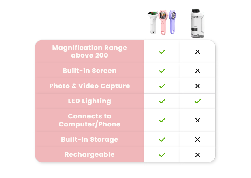 With a 100x-1000x magnification range, built-in storage for up to 400 photos, and adjustable LED lights, the ExplorerScope Pro takes exploration to the next level.